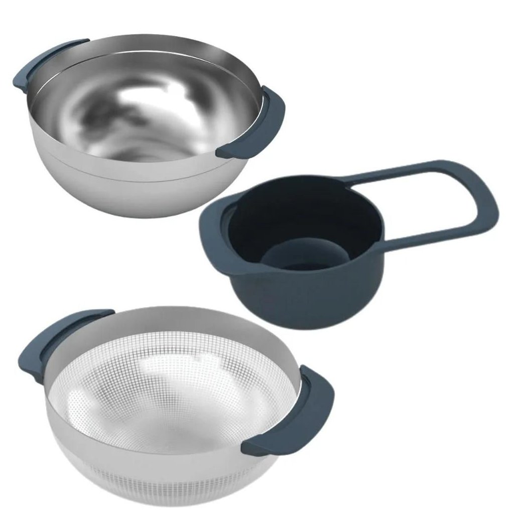 Le grand bol avec fond antidérapant cache 8 autres aides pratiques. La passoire spacieuse en acier inoxydable est idéale pour verser et rincer, la passoire fine en acier inoxydable permet de filtrer facilement une sauce ou un bouillon. Un petit bol en acier inoxydable avec une graduation et un bec verseur peut être utilisé pour verser d'autres ingrédients. 5 tasses à mesurer de différentes tailles peuvent être utilisées pour la cuisson à la tasse tant appréciée. Cet ensemble pratique vous aidera de manière fiable non seulement pour la cuisine et la pâtisserie, mais aussi, par exemple, lorsque vous avez envie d'un fruit qui doit être rincé rapidement dans une passoire.