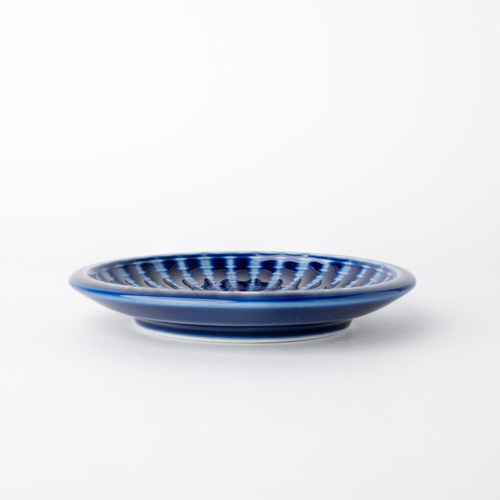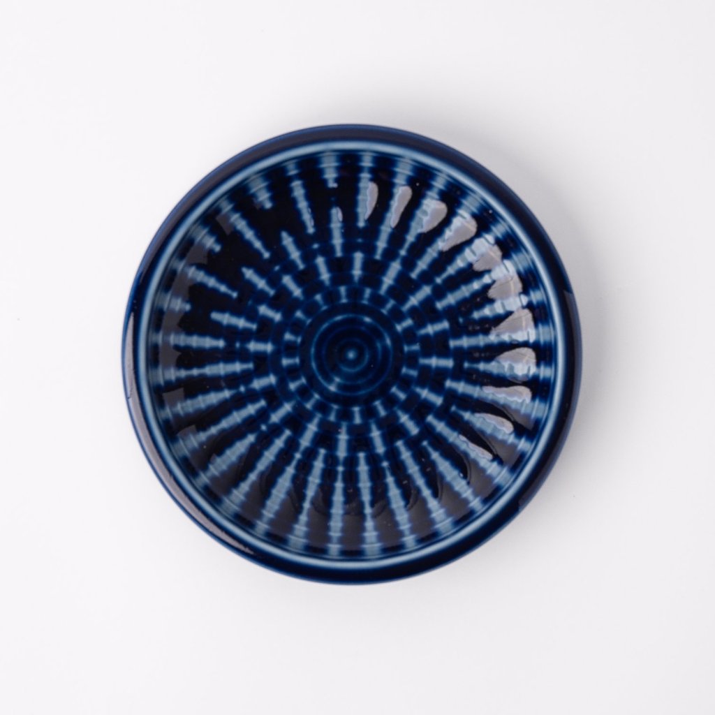 - Assiette à dessert INDIGO d'un diamètre de 12 cm impressionne par son émail bleu profond et son motif radial distinctif, qui semble à la fois moderne et traditionnel.