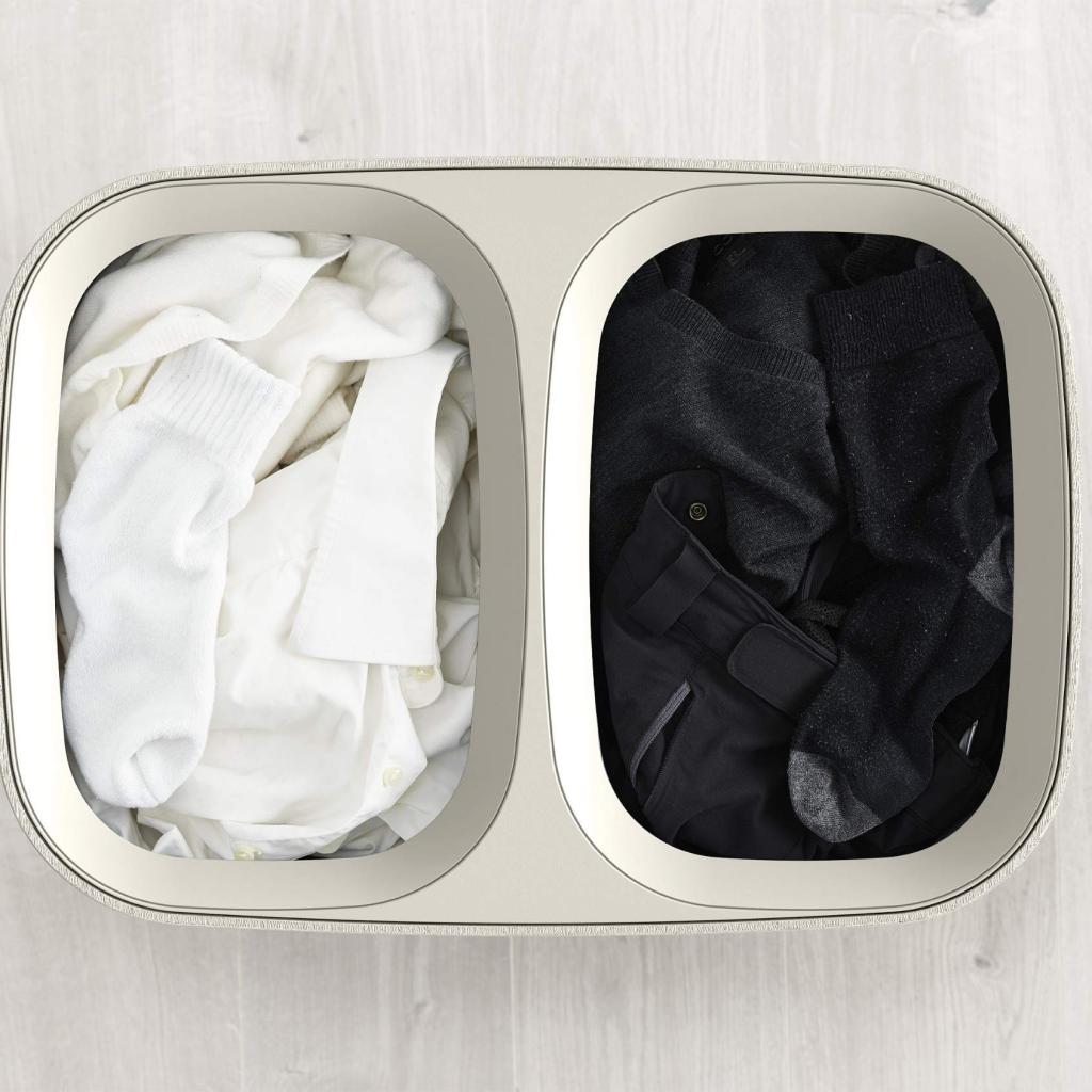 - Deux compartiments séparés d'une capacité de 45 litres permettent de séparer facilement le linge clair, foncé et coloré dès le rangement.