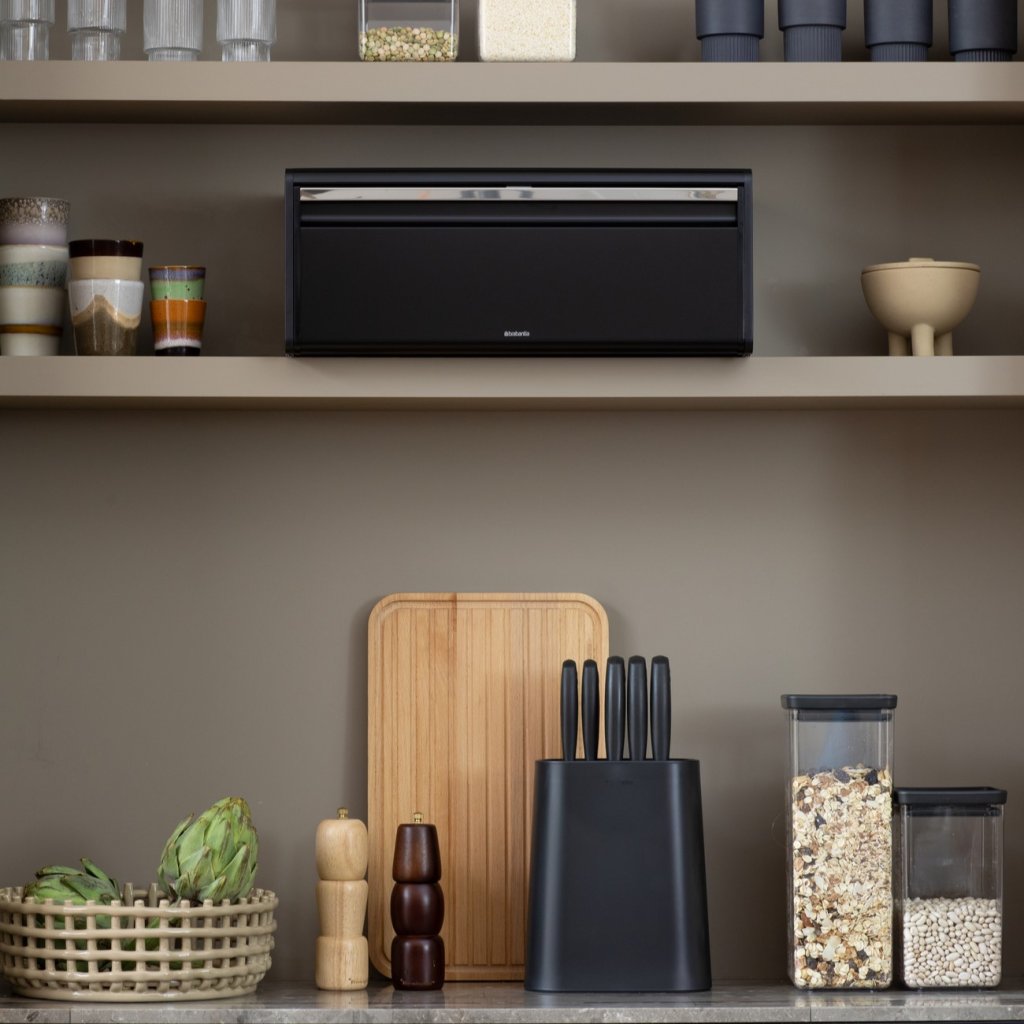 - pratique boîte à pain Brabantia FALL FRONT en couleur noire élégante est conçu pour stocker jusqu'à deux pains sans prendre de place inutilement