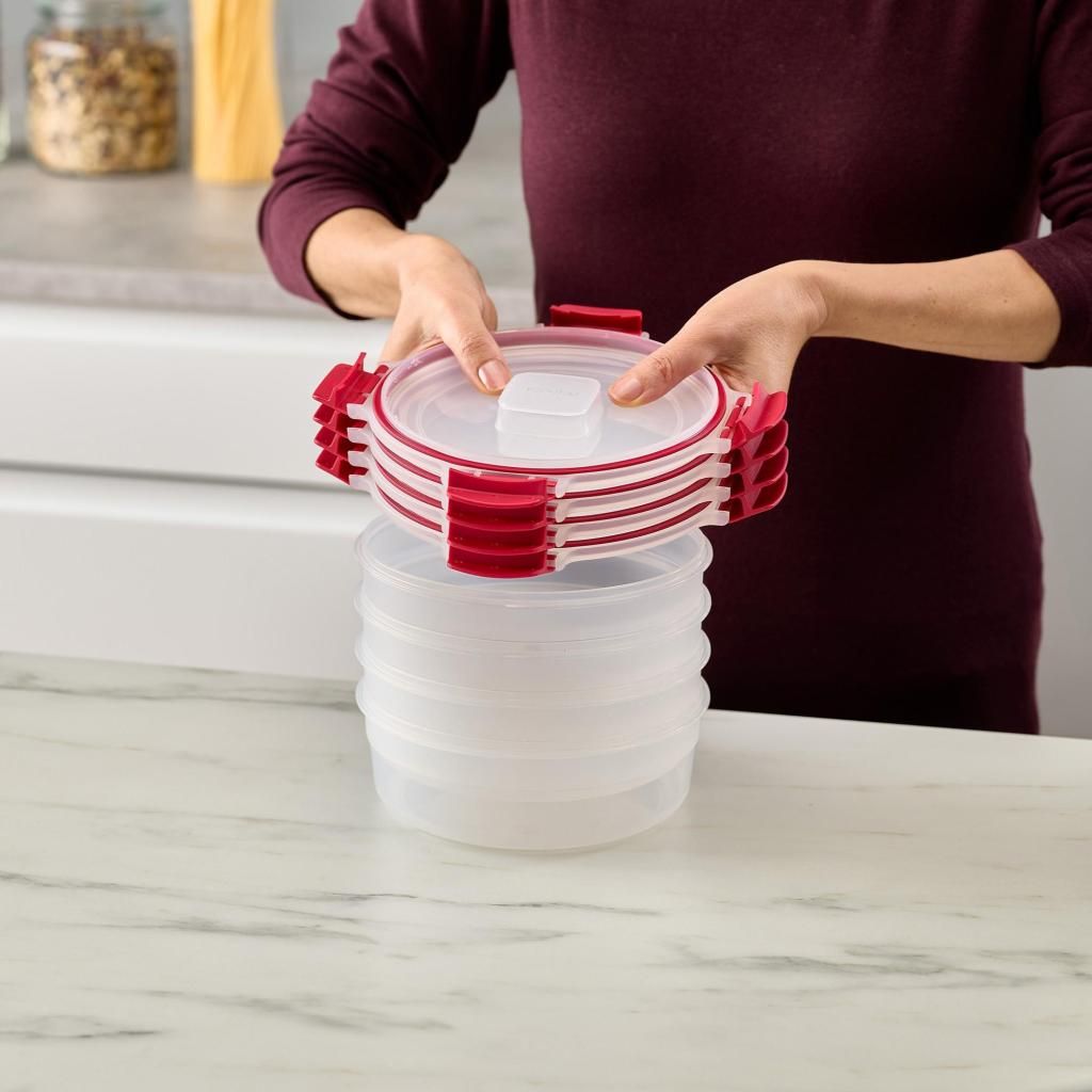 - Les couvercles empilables tiennent fermement en place, même lorsque plusieurs récipients remplis sont empilés les uns sur les autres, gardant ainsi le réfrigérateur clair et organisé.