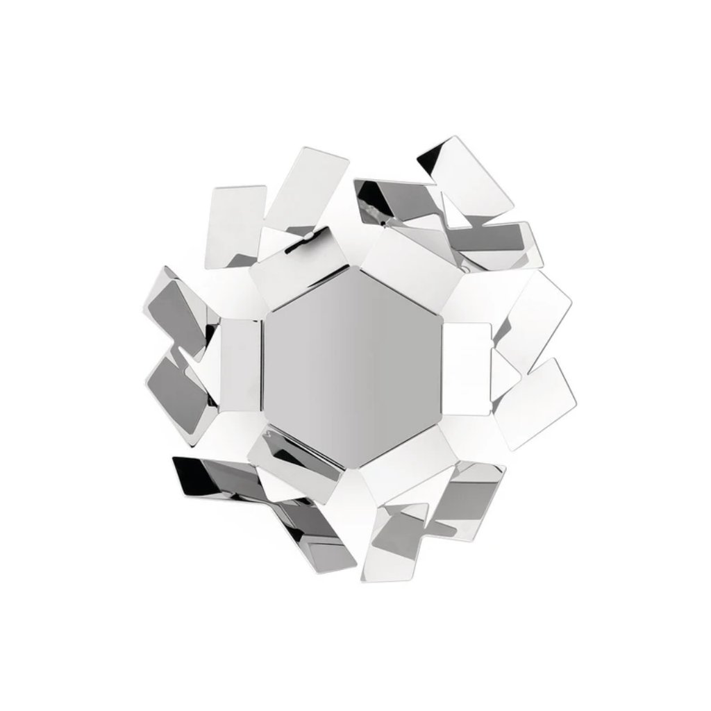 Coupe à fruits de la collection La Stanza dello Scirocco, conçue par le designer sicilien Mario Timarchi. La collection s'inspire de l'atmosphère magique des vieilles maisons siciliennes, dont les pièces sont dépourvues de fenêtres et n'ont généralement qu'une seule lumière. Leurs habitants attendent que la grande chaleur et le vent sec du sud appelé Scirocco, qui apporte avec lui des nuages de poussière sableuse du Sahara, se calment. Avec ses petits fragments de tailles différentes et son irrégularité géométrique, la collection offre un déséquilibre engageant d'ombre et de lumière.