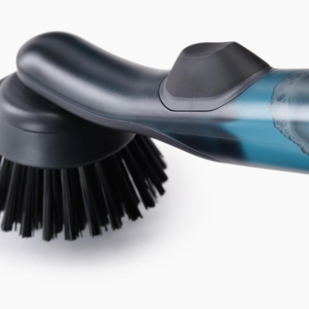 - Il suffit d'appuyer sur le bouton supérieur et la quantité exacte de liquide vaisselle est libérée directement dans les poils pour un nettoyage immédiat et efficace des saletés.