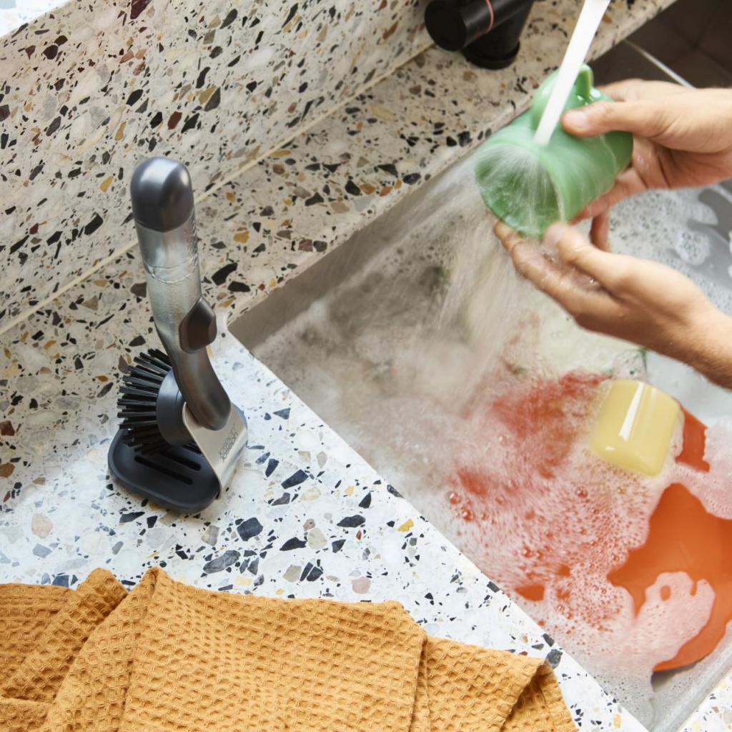 - Le réservoir intégré pour le liquide vaisselle permet d'avoir le savon directement dans la poignée, de sorte que le lavage se déroule en douceur sans avoir à chercher constamment la bouteille.