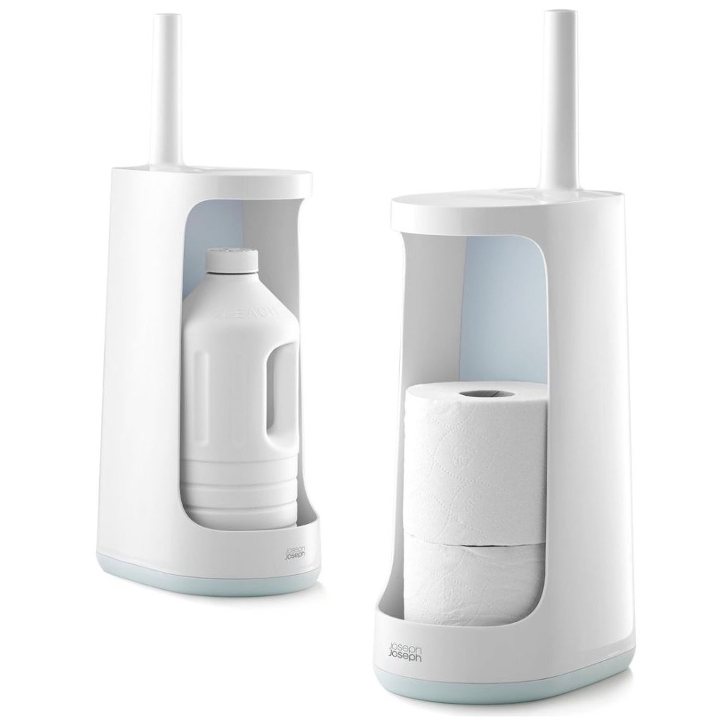 La brosse à toilettes en silicone FLEX STORE de Joseph Joseph a une tête en forme de "D" qui s'introduit facilement dans les endroits difficiles à atteindre ou sous le rebord de la cuvette. Les différents "poils" sont espacés de manière optimale sur la tête de la brosse, de sorte que la saleté ne s'y colle pas et que l'eau s'écoule plus rapidement qu'avec une brosse classique. Un détail astucieux est l'espace de stockage pour jusqu'à 3 rouleaux de papier toilette ou de désinfectants à l'arrière du distributeur.