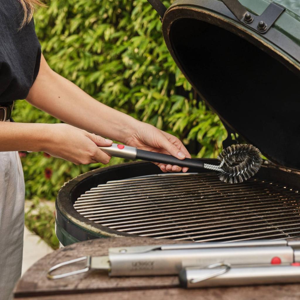La soirée barbecue ne se termine pas avec le dernier morceau de steak, mais aussi avec le nettoyage et la remise en place des objets. Brosse que l'on peut simplement rétracter et verrouiller, elle n'encombre pas inutilement et n'ajoute pas de désordre supplémentaire dans un coin déjà bien rempli d'équipements. C'est un petit détail qui fait que tout le processus a un début, un cours et une fin propre.