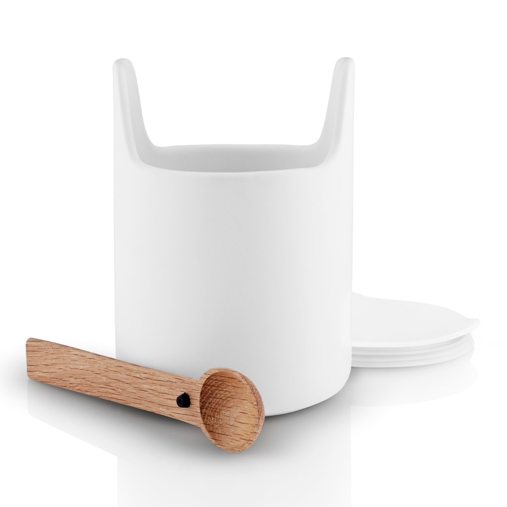Le récipient alimentaire multifonctionnel en céramique Eva Solo associe une couleur blanche très tendance à une cuillère en bois de chêne clair, qui ajoute un ton chaud à l'ensemble et sert également de poignée. Il utilise un design simple et distinctif avec un haut degré de fonctionnalité. En outre, le récipient est équipé d'un couvercle étanche à l'air.
