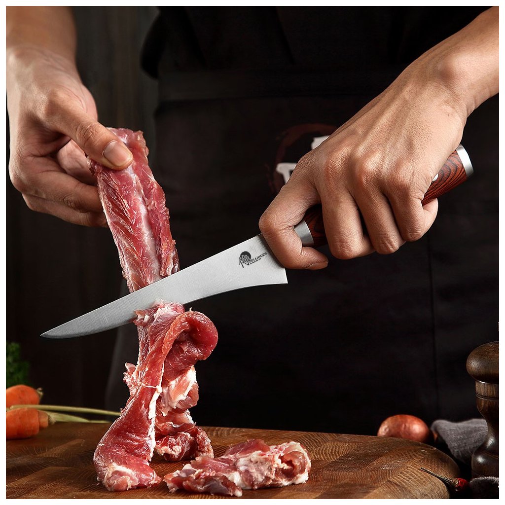 - la lame courbe et effilée permet de couper la viande des os et des tendons et de désosser les articulations et les os