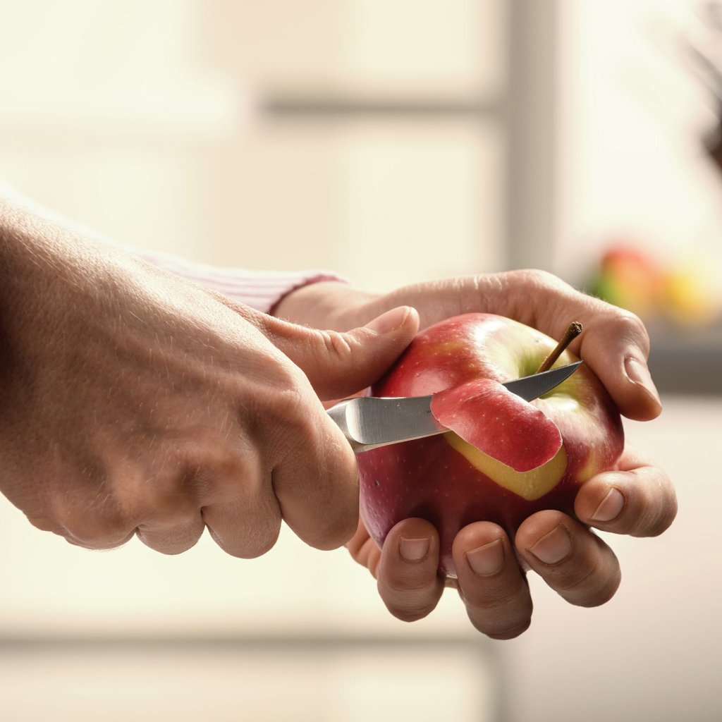 Le couteau à éplucher Ikon est un petit couteau léger et pratique, doté d'une lame droite incurvée et d'une pointe fixe. Il épluche les pommes de terre, les fruits et les légumes, et convient également pour enlever les taches sur les pommes de terre.