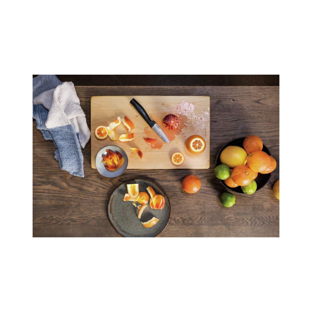 De petits couteaux sont également nécessaires dans la cuisine. Le couteau Fiskars de la série Hard Edge, avec sa lame droite de 9 cm et sa pointe acérée, est idéal pour éplucher et trancher les petits légumes et les fruits. Par exemple, il est parfait pour racler les pommes de terre nouvelles ou les carottes, pour enlever le trognon d'une pomme ou pour couper une prune en deux. La lame du couteau en acier inoxydable dur de haute qualité reste affûtée pendant longtemps grâce à la technologie d'affûtage spéciale LZR-EDGE™.
