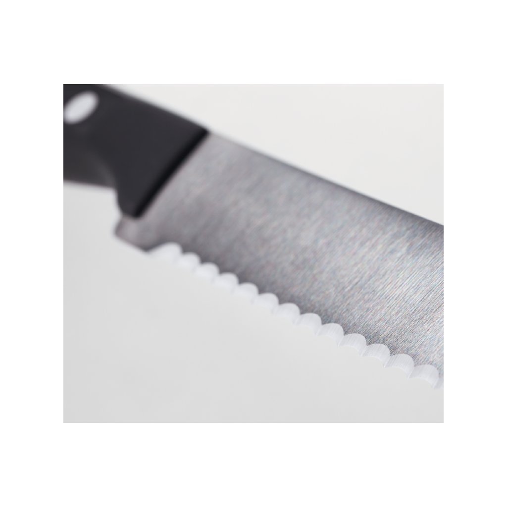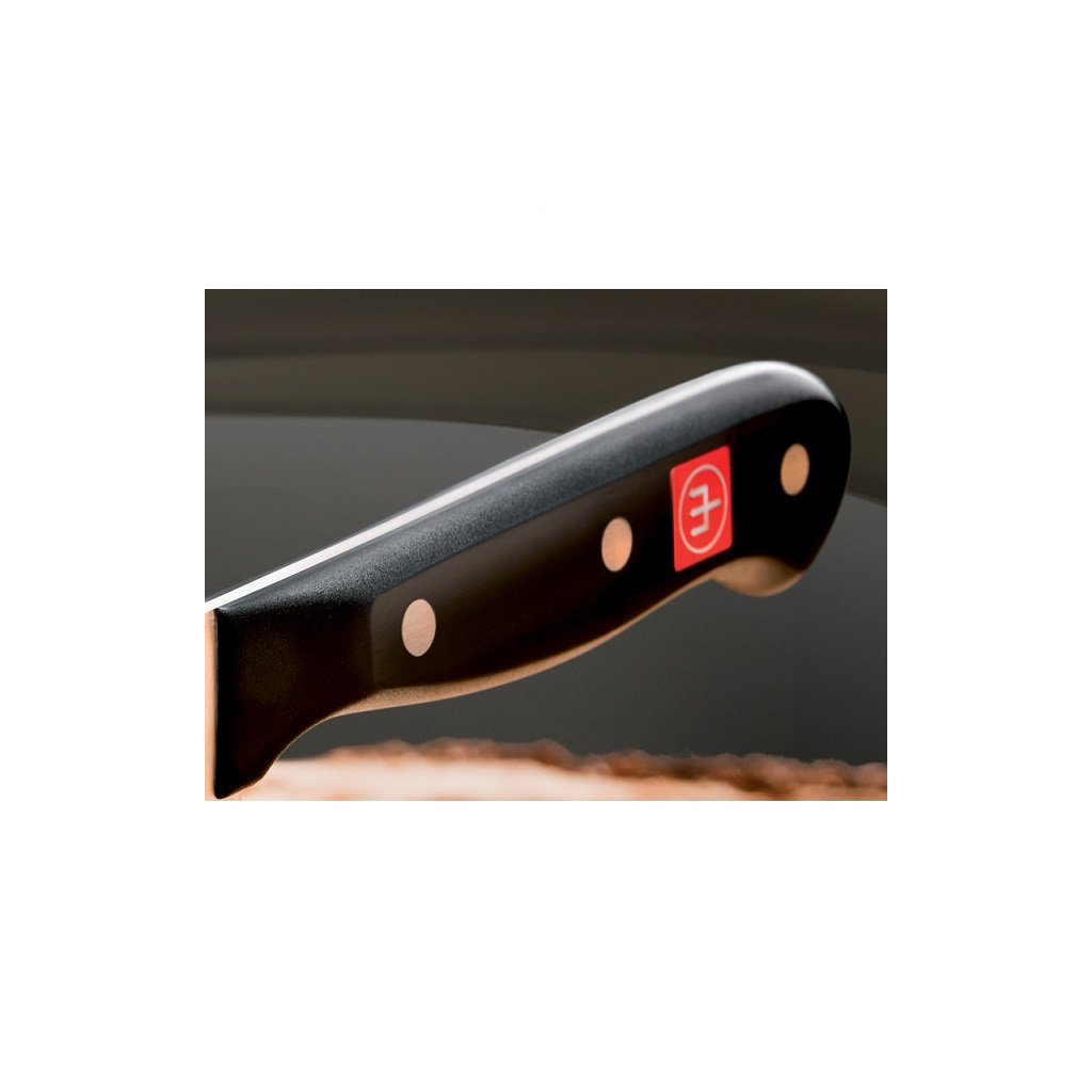 La lame dentelée de ce couteau est idéale pour le jambon et les grosses pièces de viande, les fruits et les légumes. Le couteau fait partie de la gamme Gourmet, dans laquelle vous trouverez des couteaux non forgés affûtés avec une technologie spéciale garantissant un tranchant extrême des couteaux. Les poignées moulées sont en matière synthétique et il n'y a pas d'espace entre la poignée et l'acier pour des raisons d'hygiène, la connexion est rivetée. Les couteaux sont parfaitement équilibrés et tiennent confortablement dans la main.