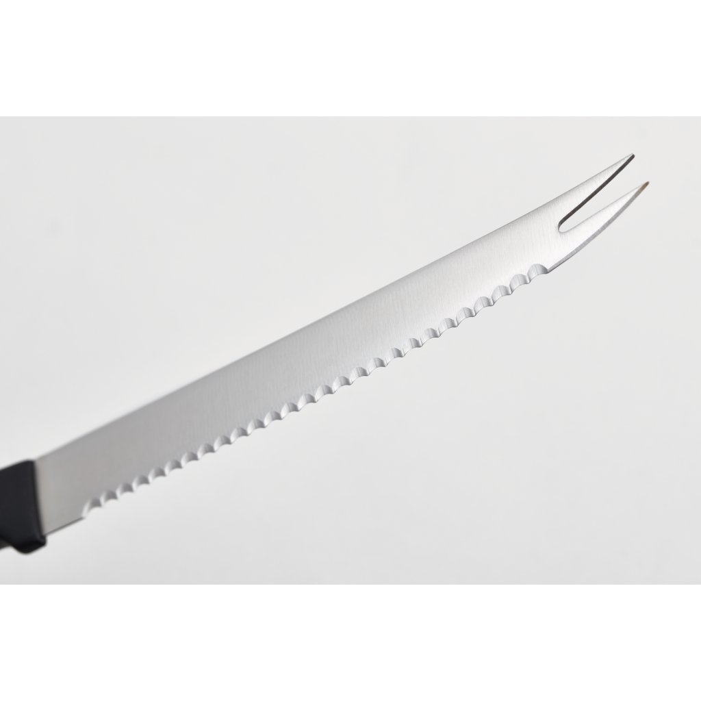 Ce couteau à lame dentelée tranche les tomates les plus mûres aussi finement que vous le souhaitez. La pointe fourchue est idéale pour le service. Ce couteau fait partie de la série Gourmet, dans laquelle vous trouverez des couteaux non forgés, affûtés avec une technologie spéciale qui garantit un tranchant extrême. Les poignées moulées sont en matière synthétique et il n'y a pas d'espace entre la poignée et l'acier pour des raisons d'hygiène, la connexion est rivetée. Les couteaux sont parfaitement équilibrés et tiennent confortablement dans la main.