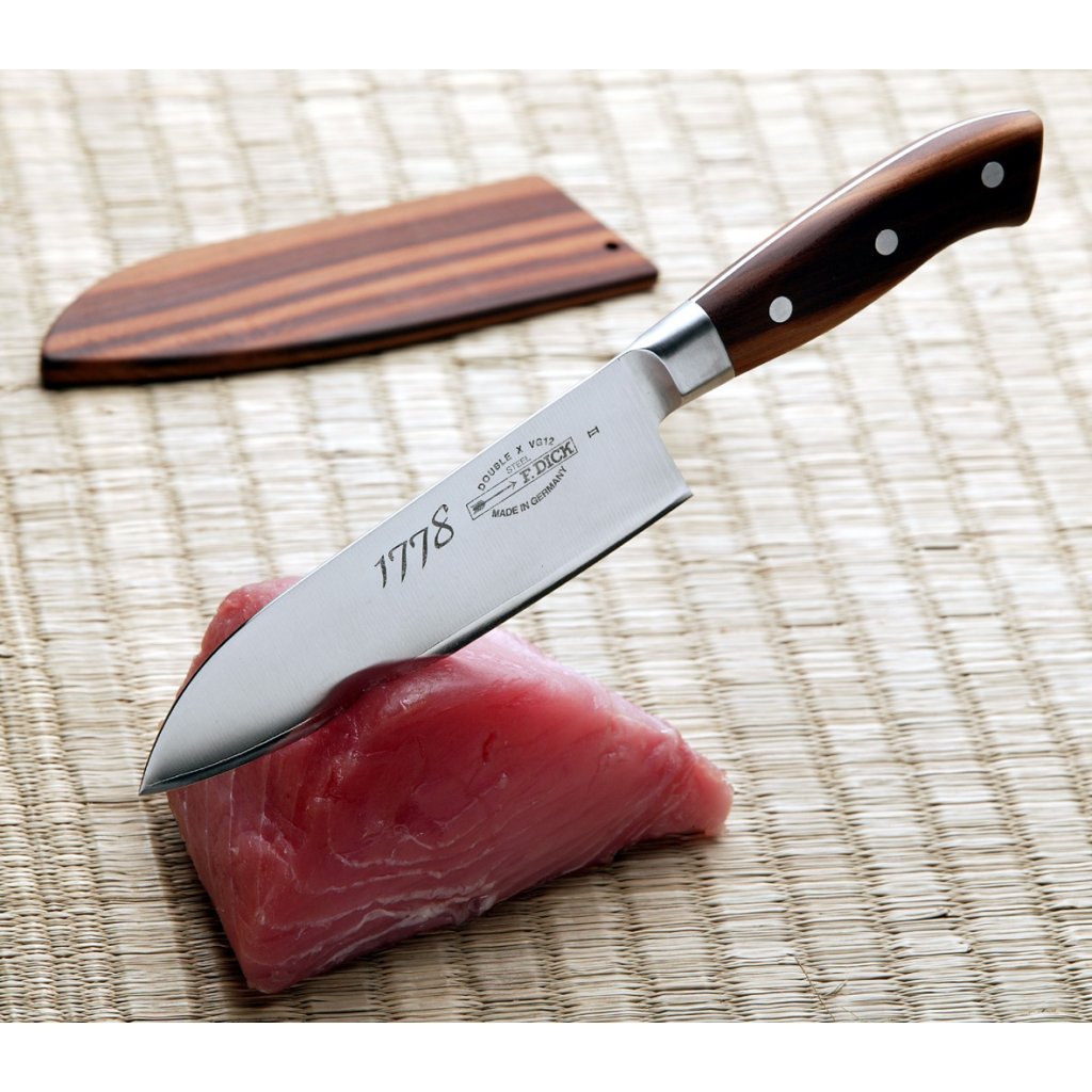 Forgé, série anniversaire limitée : le cœur des couteaux de cette série exceptionnelle est constitué de très fines couches d'acier au carbone " Double X VG 12 " hautement allié, d'une dureté extrême de 61˚ HRC. Le résultat est une coupe particulièrement efficace et une prolongation significative de la durée de vie de la lame. Le noyau en acier inoxydable stratifié est adapté aux aliments. Tous les couteaux de la série 1778 sont affûtés et dressés à la main. Le manche et la lame sont également fabriqués par des spécialistes de Dick.