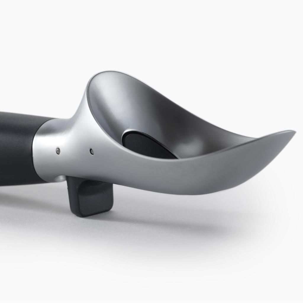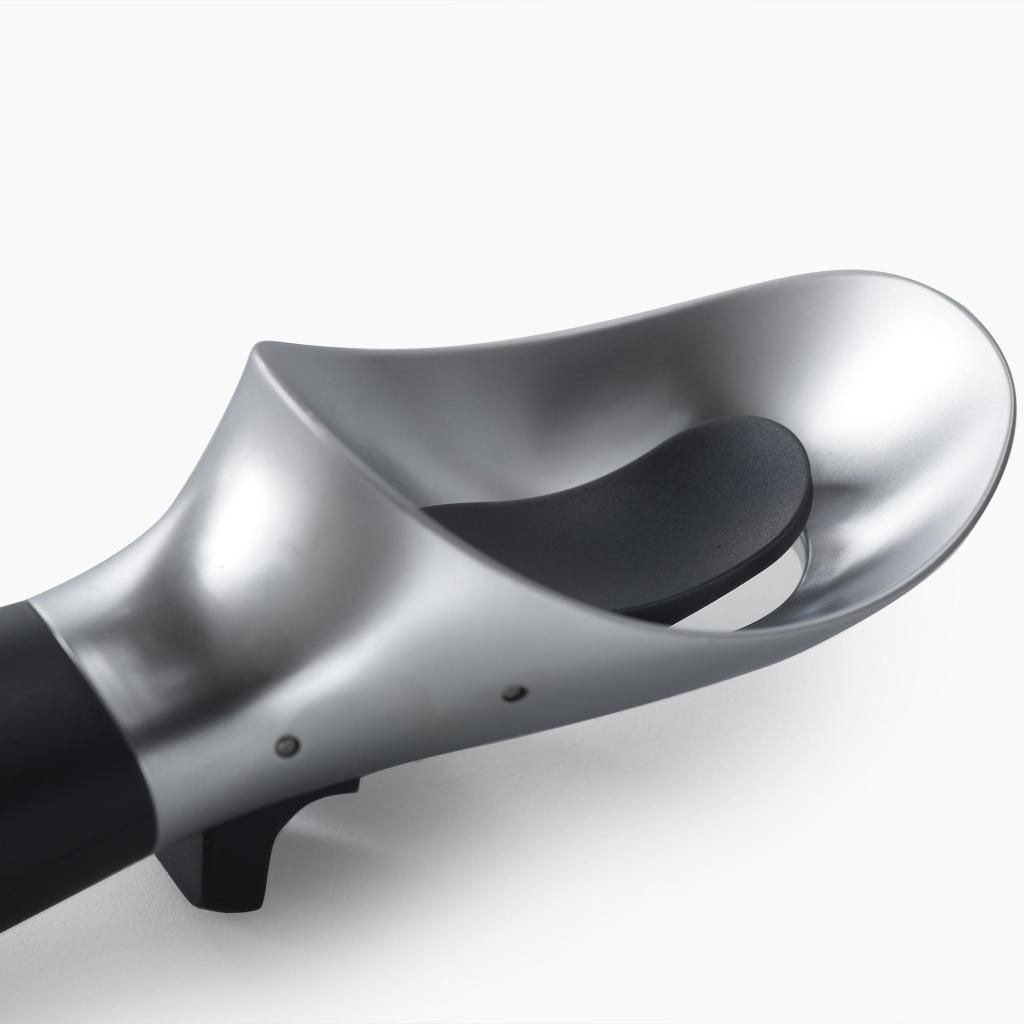 - Le mécanisme de déclenchement pratique permet de détacher rapidement une portion de glace de la cuillère, sans avoir besoin de recourir à d'autres ustensiles pour la retirer.