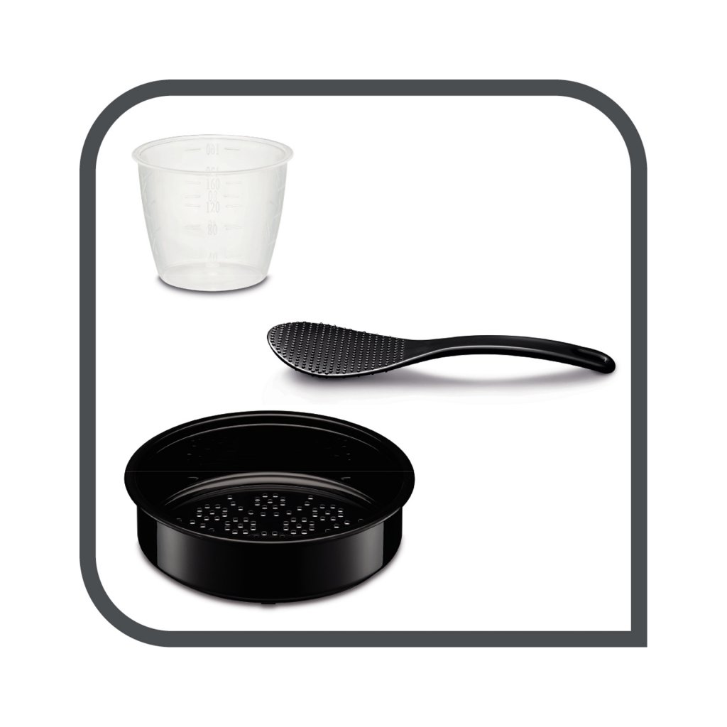 Il suffit d'appuyer sur un bouton pour que le cuiseur à riz cuise le riz parfaitement mou et le garde chaud jusqu'au moment de le servir. 3 programmes. Il permet de cuire différents types de riz, de céréales et de cuire à la vapeur une variété de plats. L'emballage comprend un panier à vapeur, une cuillère à riz, une tasse à mesurer. Les parties amovibles vont au lave-vaisselle. |