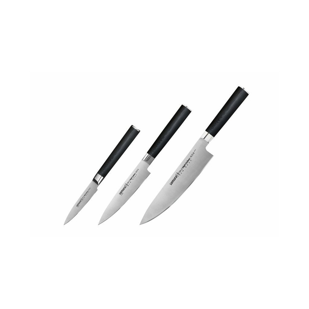Le set de couteaux de cuisine japonais professionnels comprend les types les plus populaires de couteaux de cuisine professionnels et domestiques - couteau à légumes et à fruits, couteau utilitaire et couteau de chef européen, tous fabriqués en acier AUS 8 à une seule couche de première qualité. Ce set de couteaux est un must-have pour toute cuisine et sera idéal à la fois pour un usage privé et comme cadeau utile. Emballé dans une boîte en carton.