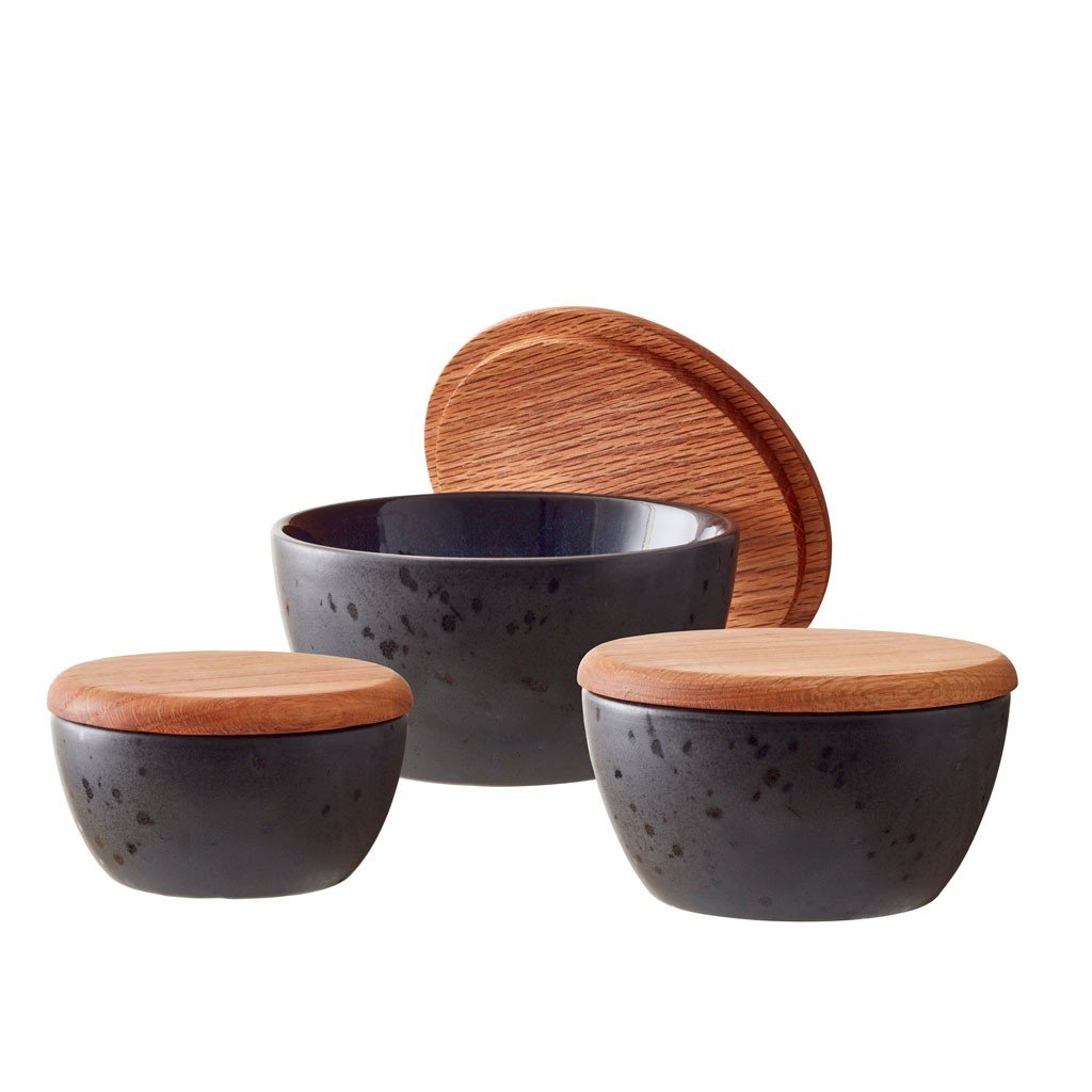 L'ensemble contient 3 pots à couvercle en chêne de 10, 12 et 14 cm de diamètre.