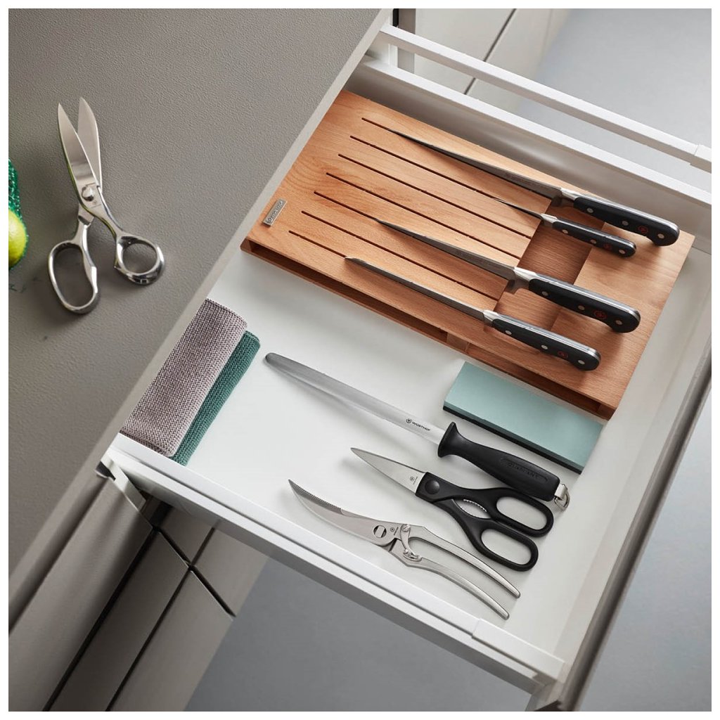 Chaque couteau doit être aiguisé de temps en temps, car il s'émousse après une utilisation prolongée. Pour entretenir et raviver la lame, on utilise des pierres à aiguiser chromées. Pour aiguiser les couteaux, nous recommandons les pierres à aiguiser WÜSTHOF. Pour les moins expérimentés, nous proposons également des meuleuses plus faciles à utiliser. Il suffit de passer doucement la lame dans la rainure d'affûtage à quelques reprises pour que la lame soit restaurée.