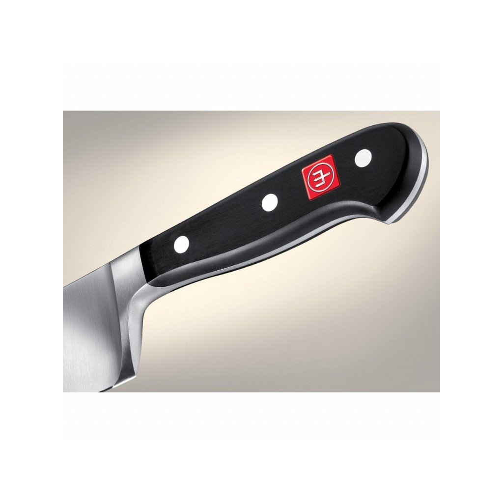 La série de couteaux Classic met parfaitement en valeur l'art du couteau de la marque WÜSTHOF. C'est la série la plus populaire de la gamme WÜSTHOF, et pas seulement en raison de son grand confort d'utilisation. Il s'agit de couteaux classiques à manche riveté, dont les lames sont forgées d'une seule pièce en acier inoxydable allié X50CrMoV15. Grâce à l'utilisation de matériaux de haute qualité et à un meulage de précision, ils présentent un tranchant élevé et durable. Les couteaux Classic, très fonctionnels, sont fabriqués avec beaucoup de soin dans les moindres détails. Exactement comme prévu pour les couteaux de Solingen. Après la première utilisation, vous ne voudrez plus d'un autre couteau..