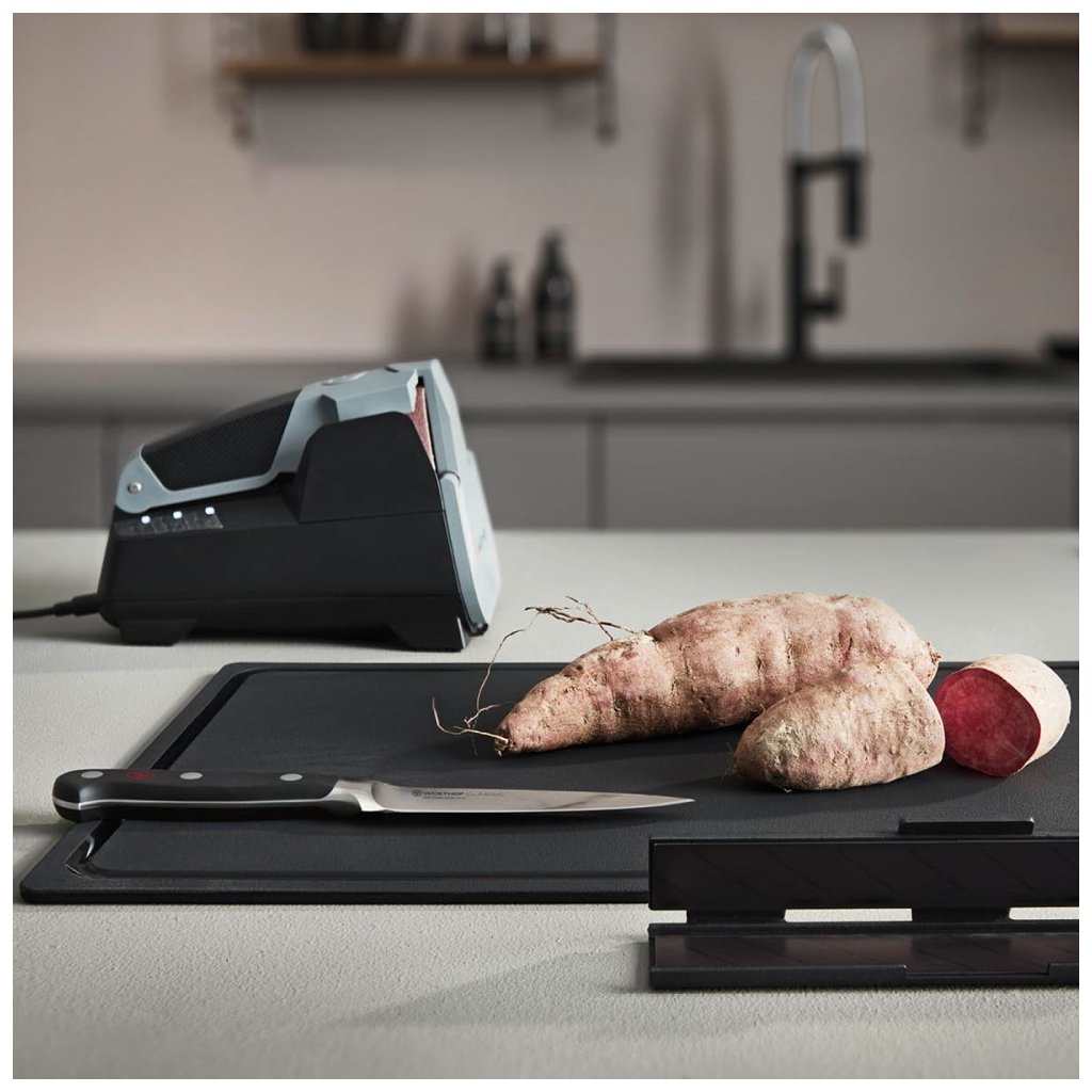 Chaque couteau doit être aiguisé de temps en temps, car il s'émousse après une utilisation prolongée. Pour entretenir et raviver la lame, on utilise des pierres à aiguiser chromées. Pour aiguiser les couteaux, nous recommandons les pierres à aiguiser WÜSTHOF. Pour les moins expérimentés, nous proposons également des meuleuses plus faciles à utiliser. Il suffit de passer doucement la lame dans la rainure d'affûtage à quelques reprises pour que la lame soit restaurée.
