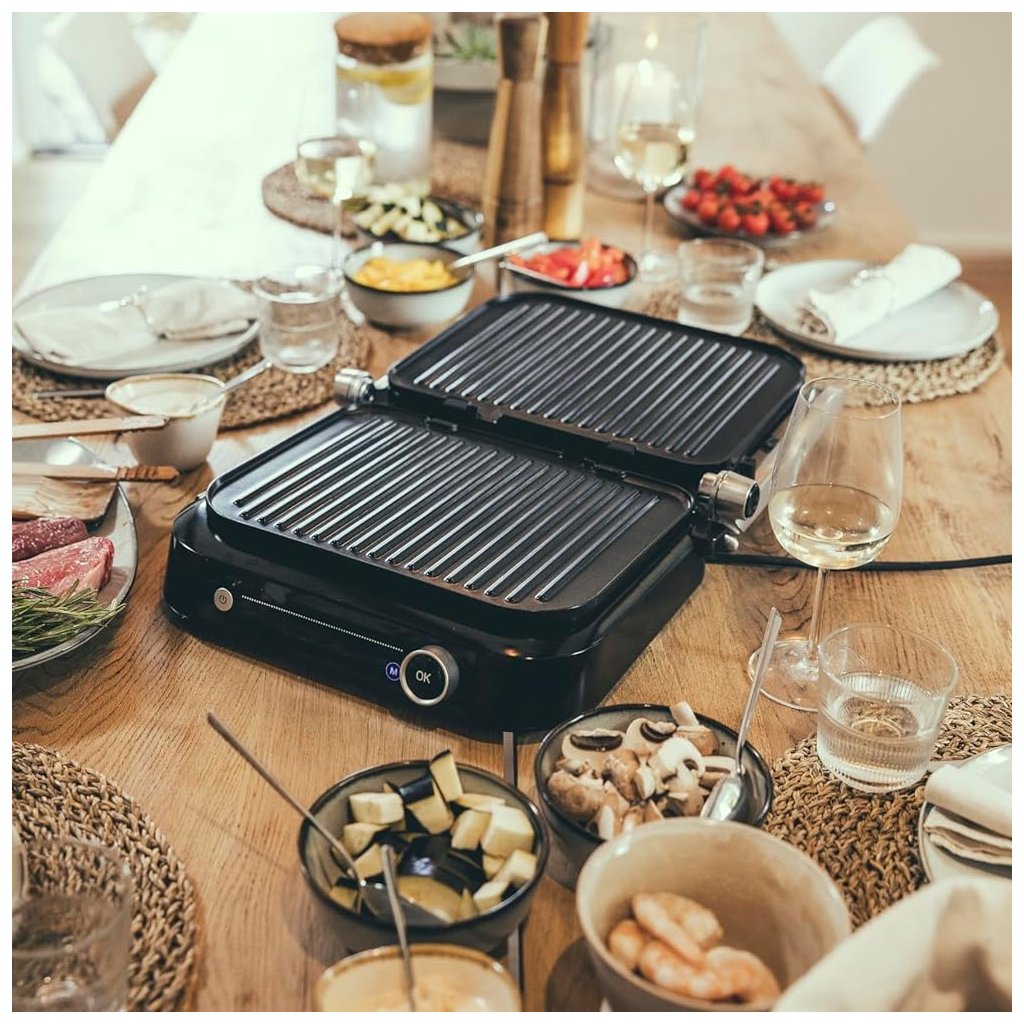 - gril de contact multifonctionnel avec fonction gril de table (peut être déplié et grillé sur les deux plaques en même temps)
