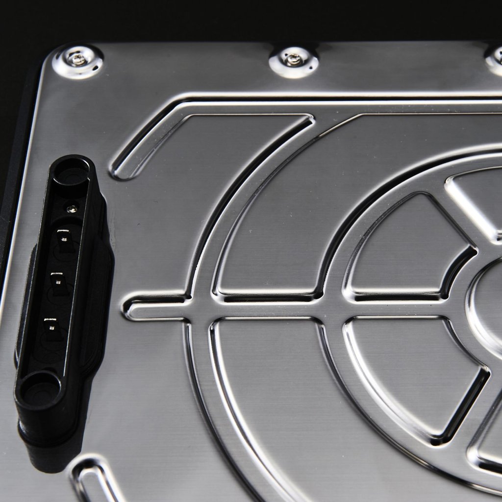 - A l'intérieur se trouve un système technologique à cinq couches qui relie la plaque du gril, le circuit de chauffage, les couches d'isolation et la base en acier inoxydable avec une réflexion de la chaleur en miroir pour un chauffage efficace.