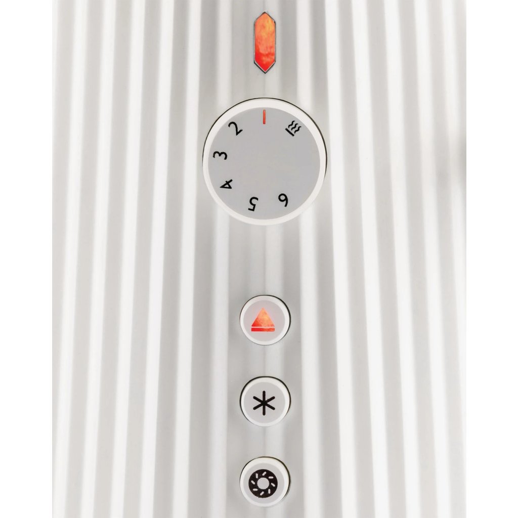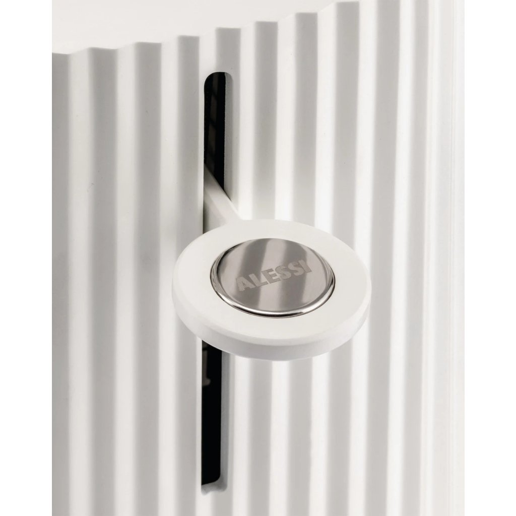 Grille-pain design Plissé des maîtres italiens du design appliqué Alessi. La finition plissée imaginative, qui rappelle une jupe plissée, donne aux appareils un aspect frais inattendu. Les fentes et tout l'intérieur du grille-pain sont fabriqués en acier inoxydable de qualité. Le revêtement extérieur est fabriqué en résine thermoplastique de haute qualité. Pour une prise en main plus confortable, les commandes et les poignées des grilles à sandwich, qui ne sont pas incluses dans le pack de base mais vendues séparément, sont fabriquées dans le même matériau.