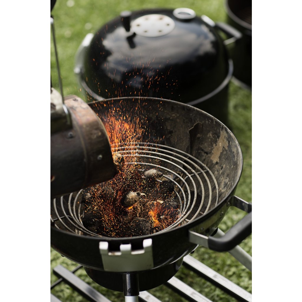 Il convient pour le charbon de bois ou les briquettes et peut contenir jusqu'à 3 kg. La grande poignée avec bouclier thermique et support supplémentaire vous permet de verser en toute sécurité les charbons chauds sur le gril.