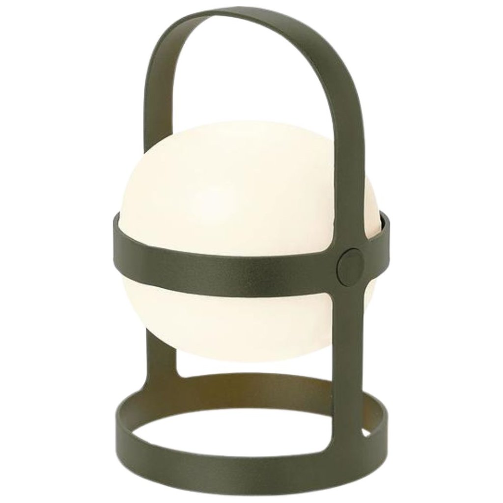 L'abat-jour est protégé par une armature en métal patiné qui sert de support et de poignée. Il est disponible en différentes teintes - ici en vert profond - et en trois tailles, celle-ci étant la plus grande d'entre elles avec une hauteur de 34 cm.