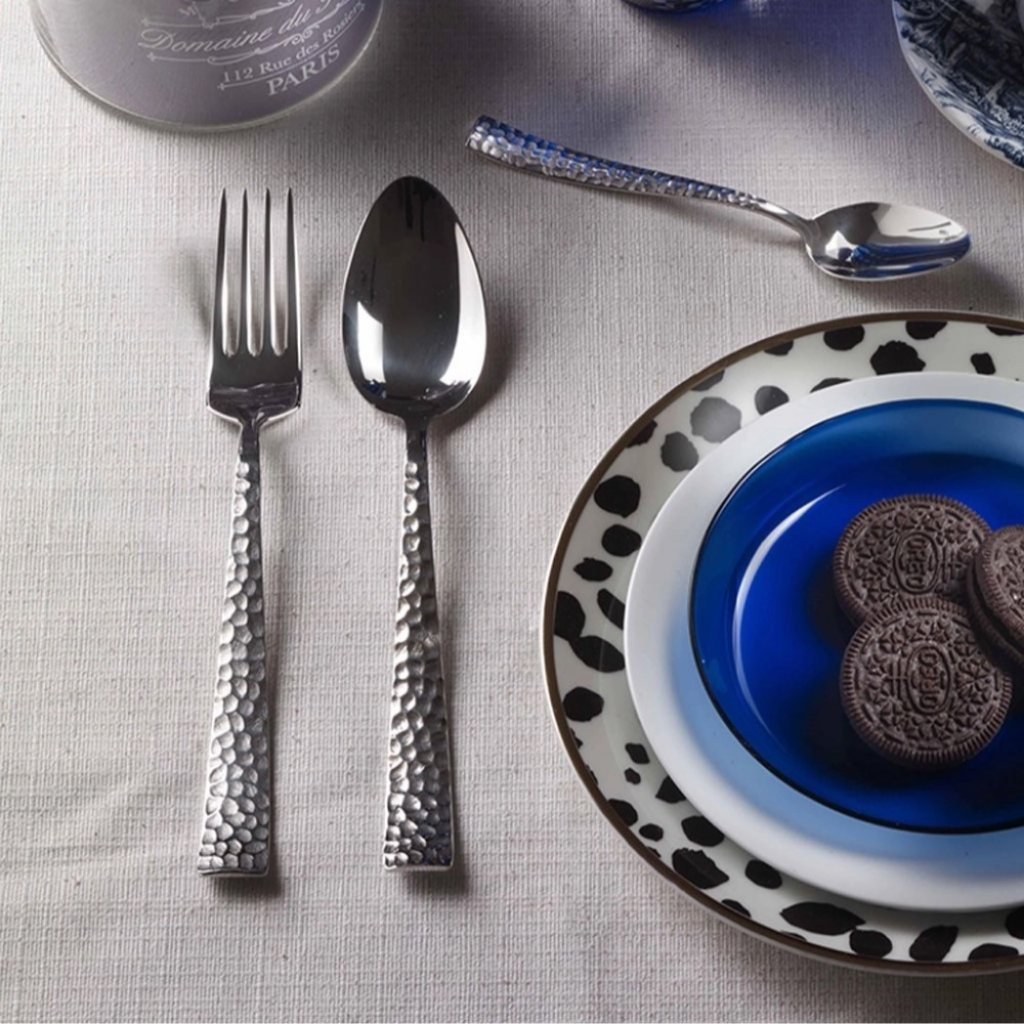 - les surfaces brillantes des couverts contrastent avec les parties mates martelées et créent un effet visuel unique