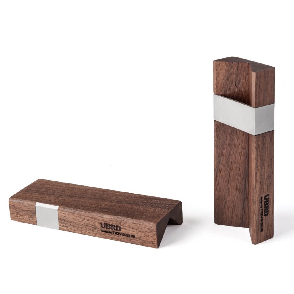 - matériau : noyer américain, acier inoxydable (sablé mat)
