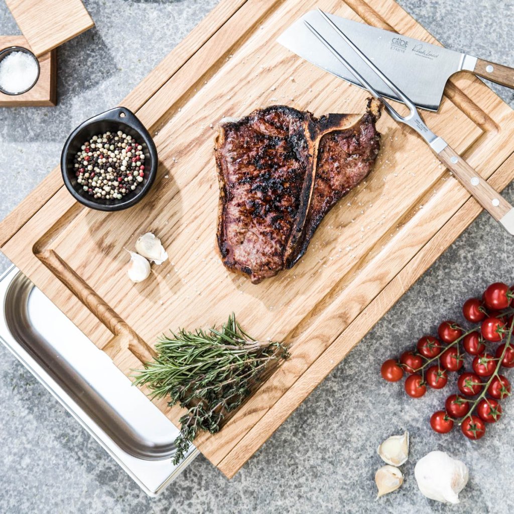 - planche à découper à double face - une face est lisse, l'autre présente une rainure permettant d'égoutter le jus des aliments tranchés