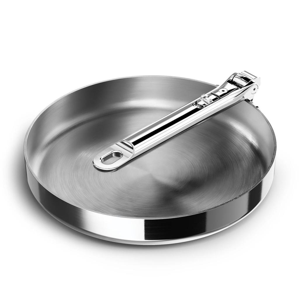 - La construction robuste à trois couches combine une surface extérieure en acier inoxydable poli, un noyau en aluminium pour une distribution uniforme de la chaleur et une surface intérieure en acier inoxydable mat.