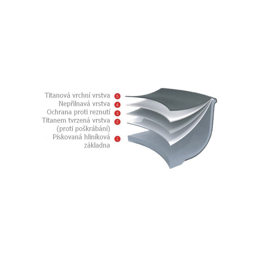 Plusieurs autres couches sont appliquées sur le moulage d'aluminium résultant pour augmenter l'anti-adhérence et la durabilité de l'ustensile de cuisine. Mais avant cela, sa surface est sablée à plusieurs reprises. Dans une étape ultérieure, le corps de la poêle ou de la casserole est durci avec des particules de titane et cuit avec une buse à plasma à des températures extrêmes dépassant 20 000 °C. Les plats sont donc indéformables et résistants aux dommages mécaniques. La deuxième couche protège le matériau contre la corrosion, tandis que la troisième couche offre d'excellentes propriétés anti-adhésion. La dernière couche supérieure durcie est antiadhésive, durcie à l'aide de particules de titane. En raison de ses propriétés exceptionnelles, il est protégé par un secret de fabrication.