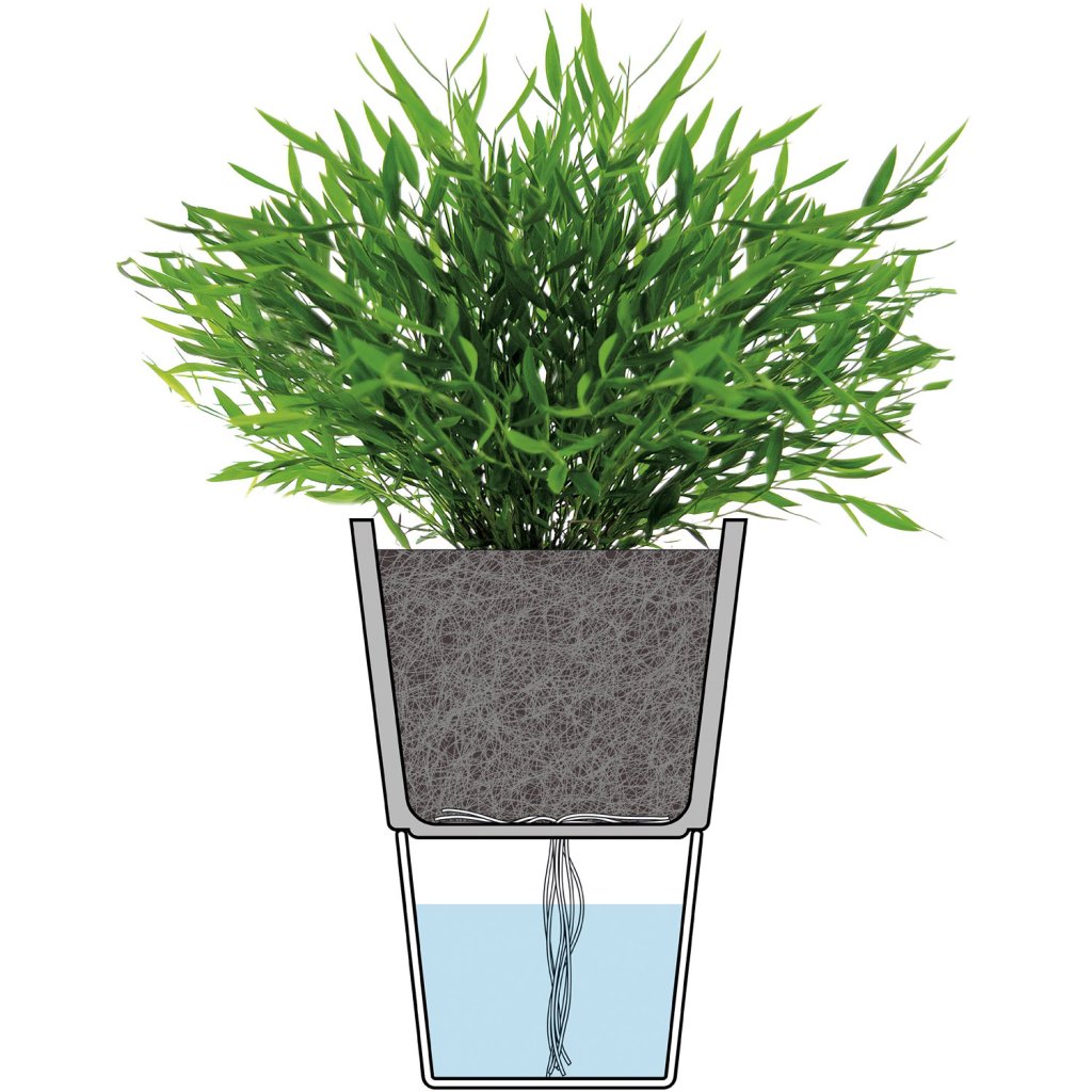 Remplissez le réservoir d'eau sous le pot et ne vous inquiétez plus. La plante s'approvisionne en eau par le biais d'une mèche en nylon qui fait office de racine. Il absorbe la quantité nécessaire en fonction de ses besoins naturels. Vous pouvez sortir le week-end ou en vacances sans vous soucier de vos plantes. Idéal pour les herbes fraîches, vous pouvez bien sûr l'utiliser aussi pour d'autres plantes.