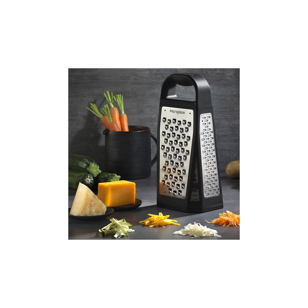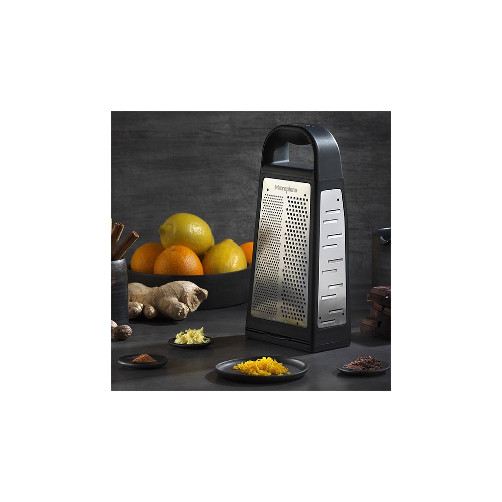 La râpe classique Elite Box à quatre faces de la série Specialty de la marque américaine Microplane® avec plateau intégré et fenêtres pratiques avec rainures facilitera votre travail en cuisine en toute occasion. Elle offre cinq surfaces fonctionnelles pour les types de râpes les plus couramment utilisés : fine, grossière, ultra-grossière, trancheuse large et la râpe à ruban, qui permet un mouvement dans les deux sens et crée des bandes plus larges spectaculaires.