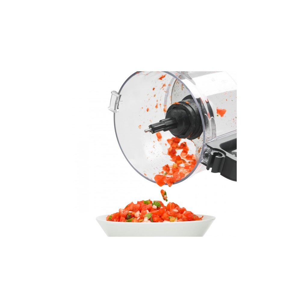 Il utilise un moteur puissant et des lames de qualité pour hacher, râper, trancher et pétrir. La base est contrôlée par de simples leviers avec rétro-éclairage LED pour 2 vitesses et un programme d'impulsion. Le robot de cuisine convient à la transformation des fruits, des légumes, du fromage, etc.