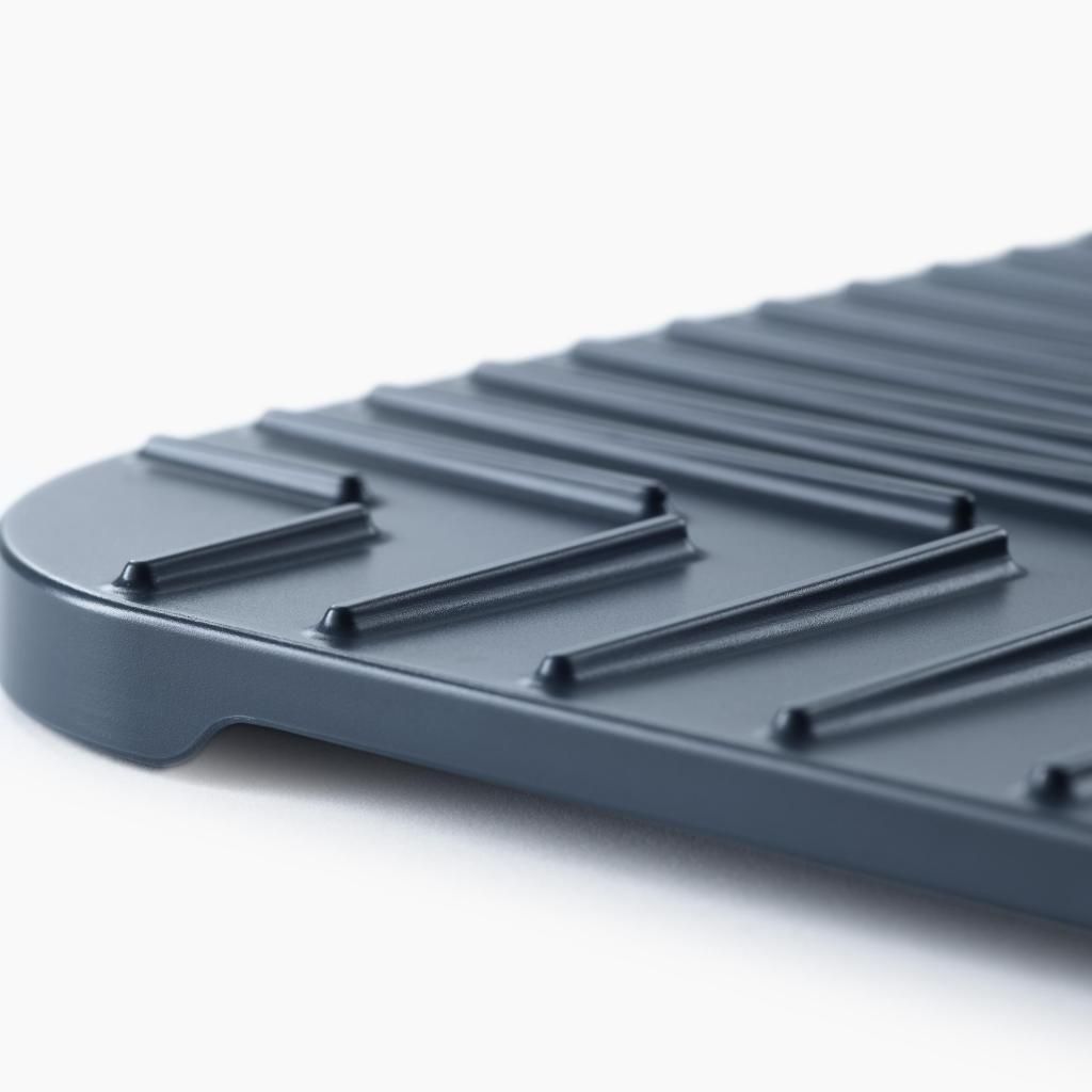- Les rainures intégrées sur la surface dirigent l'eau vers le centre du tapis, de sorte que l'eau s'écoule facilement et que la vaisselle peut sécher plus rapidement.