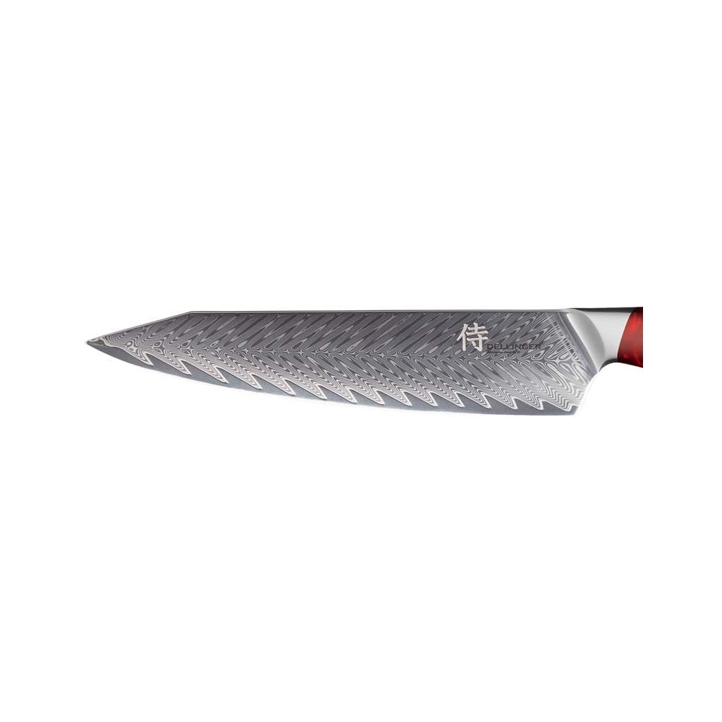 - le motif damasquiné chatoyant de la lame (rappelant une mer agitée) minimise les frottements lors de la coupe et empêche les aliments de coller à la lame