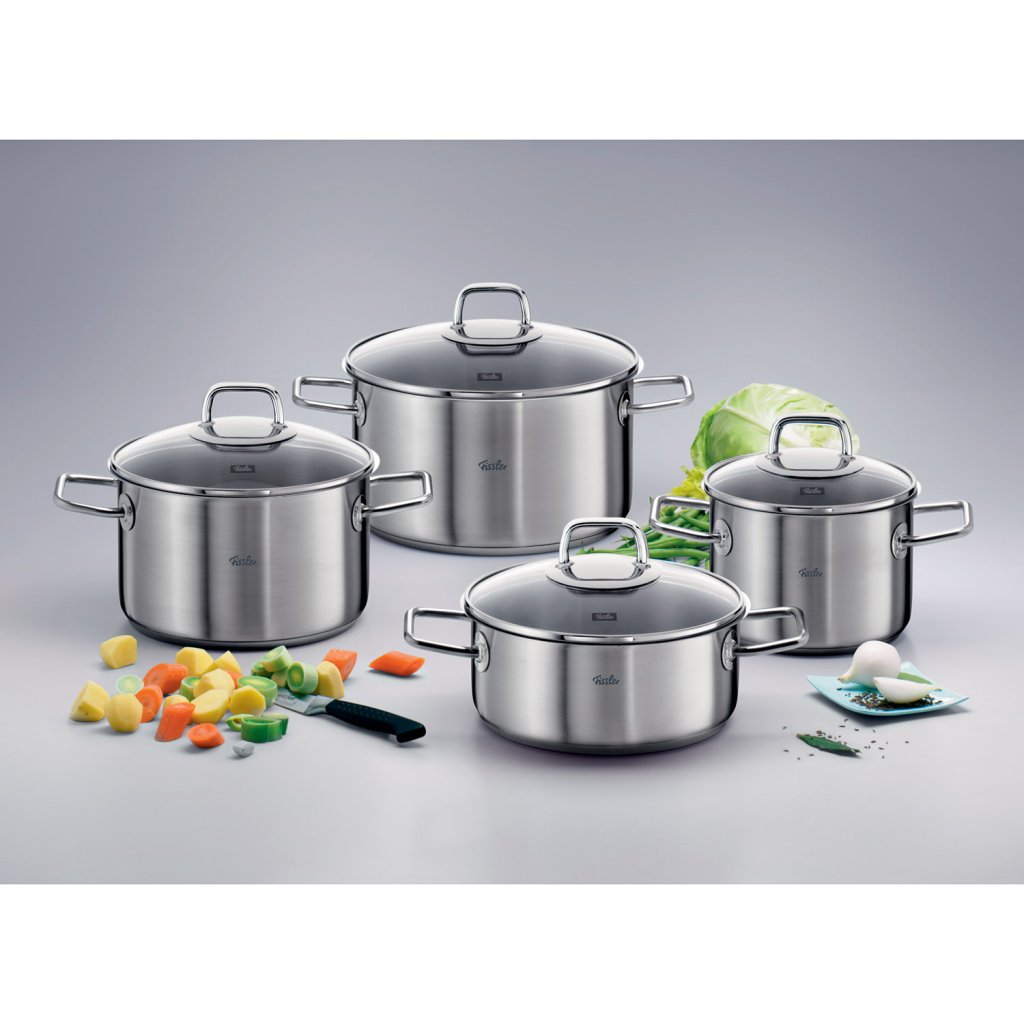 La batterie de cuisine Fissler viseo® est proposée dans des ensembles pratiques. Le design de l'ustensile de cuisine est très intemporel et s'adapte à toutes les cuisines. Des lignes épurées, une fabrication de haute qualité et des caractéristiques pratiques sont les principales raisons pour lesquelles cette gamme est si populaire auprès des clients. Le look minimaliste de l'ustensile de cuisine offre l'occasion parfaite d'éblouir, notamment avec les aliments que vous y préparez !