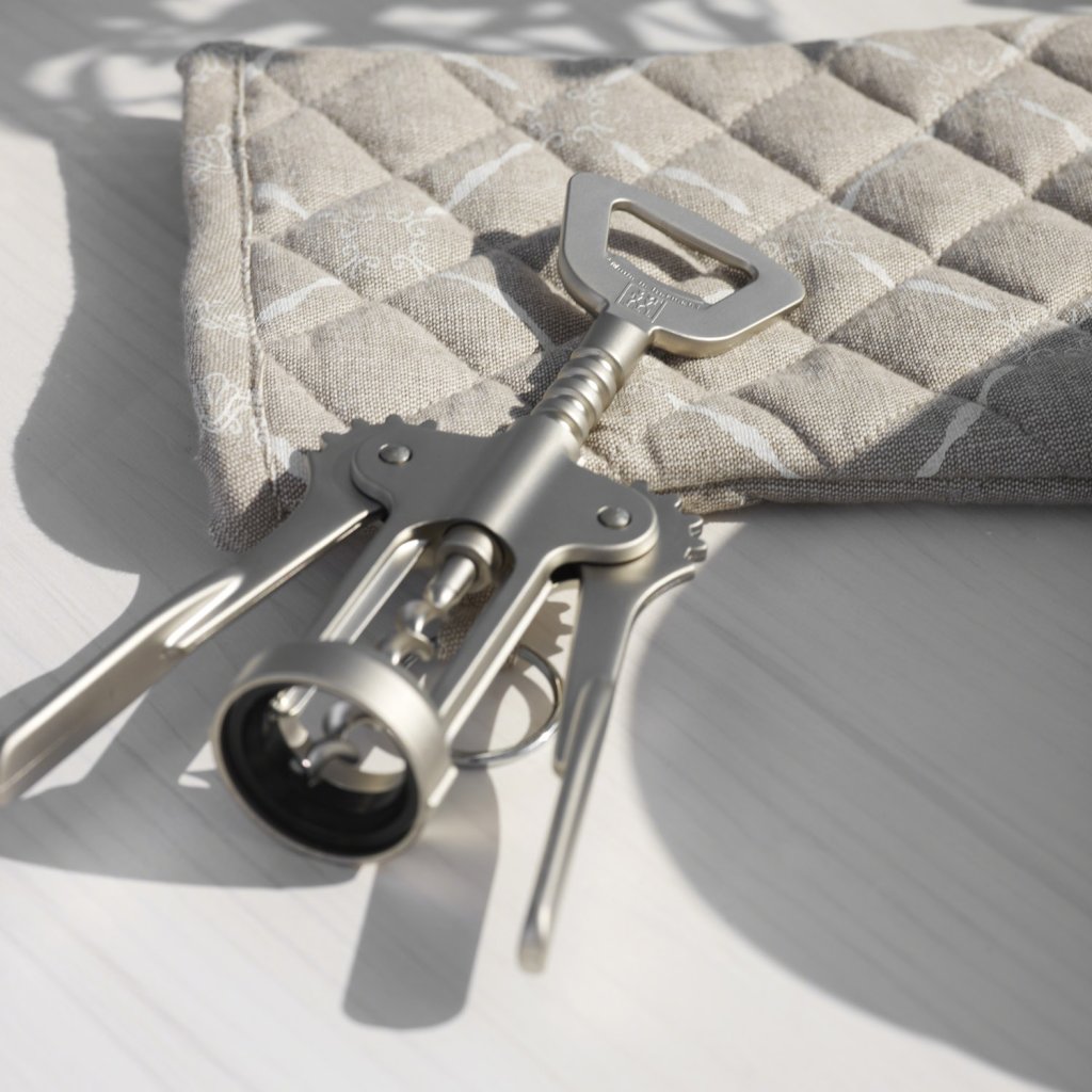 Tire-bouchon à ailettes de la société allemande ZWILLING J. A. Henckels en acier inoxydable nickelé sera un bon auxiliaire pour ouvrir les bouteilles de vin ou les capsules couronne. Il est facile à utiliser et fonctionne sur le principe de l'effet de levier. Placez le tire-bouchon sur la bouteille, tournez la poignée, mais ne tenez pas les "ailes" - les bras de levier. Une fois les deux bras levés, il suffit de les pousser latéralement vers le bas pour que l'ouvre-bouteille retire doucement le bouchon de la bouteille.