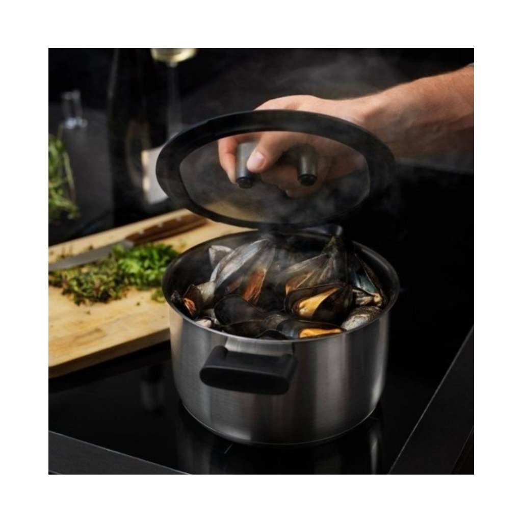 La marmite est dotée de deux poignées en bakélite qui restent froides même pendant la cuisson. A l'intérieur du pot se trouvait une tasse à mesurer très pratique. La marmite comprend un couvercle plat en verre transparent avec deux possibilités de versement, avec un rebord en silicone durable et résistant à la chaleur. La casserole peut être utilisée pour tous les types de cuisinières (plaques électriques, à gaz, en céramique et à induction). Tous les ustensiles de cuisson Hard Face passent au lave-vaisselle.